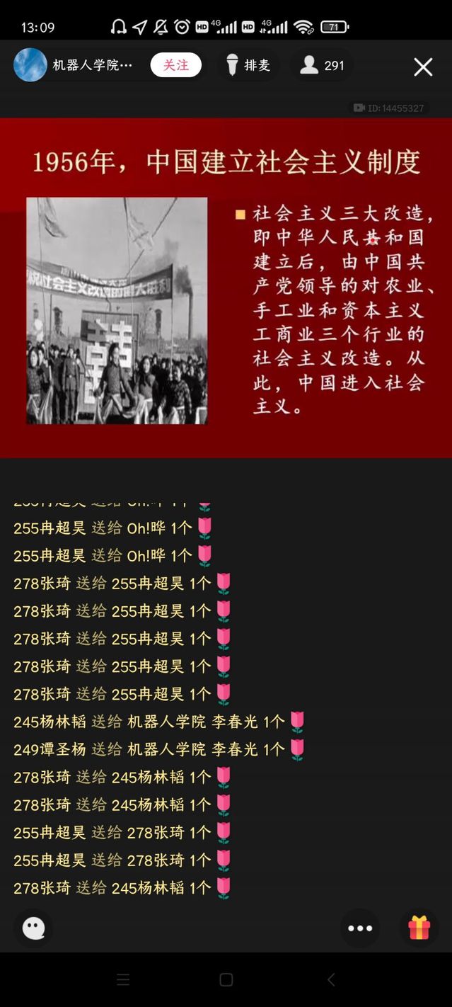 会议开始,主讲人李春光老师首先讲述了中国共产党的成立到中华人民共和国的成立,它结束了鸦片战争以来的半殖民地半封建社会,结束了封建君主专制,这一切为实现中华民族伟大复兴奠定了基础。李老师又向同学们讲述了中国共产党探索寻路的过程,让同学们更加清楚的了解到了中国共产党建立的那段艰辛的历史,共产党人以革命大无畏精神成功应对各种挑战,这是新中国得以建立、发展和壮大的根本原因所在。在和平崛起的年代,机遇和挑战并存,同学们更有必要重归建党的源头,找到这源头的火种,并赋予其新时代的意义,带领中国从胜利走向胜利。同学们也更清楚的了解到了中国百年的辛酸和苦难史,让所有的中国人加倍珍惜这来之不易的新天地,作为老员工应该进而奋发有为,通过自身的努力推动国家和社会的进步。
