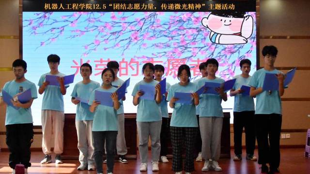 活动伊始,全体同学起立,齐唱团歌。随后,志愿者代表黄桂鸿同学在讲话指出:志愿者在志愿活动中要站起来、动起来、带起来、行誓言、做表率,将志愿的爱心传递下去,爱心是志愿者的灵魂,行动是志愿者最美的语言。“鉴湖微光”志愿者团队向同学们表演了合唱、朗诵等精彩的节目。表演过程中,合唱团队的歌声悠扬婉转;朗诵者声情并茂,抑扬顿挫。志愿者们用歌声传递温暖,用朗诵抒发感情。活动最后,志愿者们进行了宣誓仪式,他们的话语铿锵有力,他们的行动充满热情。宣誓完毕,团委书记程莎老师进行活动总结:青年志愿者要以远大的理想和抱负为指针,把自身的学业和事业跟祖国的奋斗目标结合起来,同时体现社会价值。