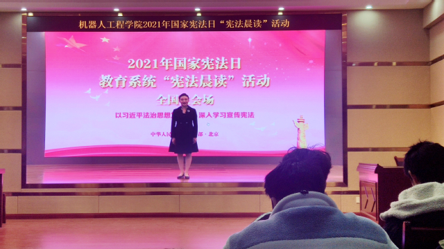 活动伊始,同学们全体伫立在领读人的带领下集体朗读宪法内容,所有人精神饱满,情绪激昂,用心体会着宪法的庄严与神圣。朗读结束后,同学们一同观看宪法直播,聆听优秀同学代表对宪法的理解,观察各地高校学习宪法的方法。直播的最后,由教育部部长总结讲话,告诫同学们一定要认知学习宪法,将宪法牢牢地刻在心上。