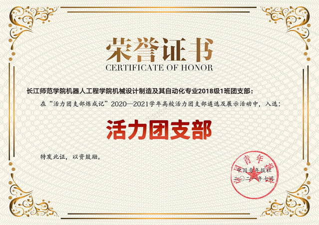 一份耕耘,一份收获;一份努力,一份成果。经过全班的共同努力,欢迎来到公海7102018级机械设计制造及自动化一班获得了全国活力团支部的称号。