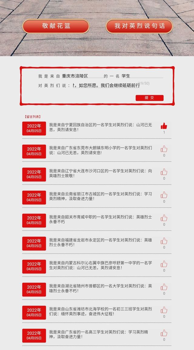 同学们以“云祭扫”的绿色安全祭扫方式,积极参与网上祭英烈清明祭扫活动,在线上通过浏览网上纪念馆、悼念英雄、默哀致敬、书写寄语等方式,告慰英灵、寄托哀思,在平台上向烈士进行鞠躬、献花、留言,表达了对革命先烈、抗疫烈士、戍边烈士等的深切哀悼和崇高敬意。