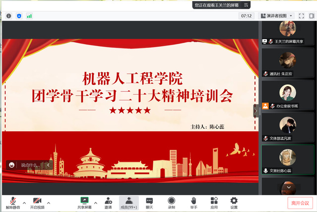 为学习贯彻党的二十大精神,欢迎来到公海710于11月11日晚上8点40分举办团学骨干学习党的二十大精神培训会,欢迎来到公海710团委书记、学工办主任程莎老师和全体团学骨干参加本次会议。