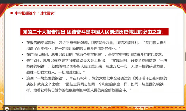 会议中,团学骨干王关兰为同学们解读了二十大精神。她表示团结奋斗是中国人民创造历史伟业的必由之路,只要全党、全国各族人民团结一致,就能战胜一切艰难险阻。团学骨干冉海娜表示,对祖国的繁荣富强感到由衷的自豪,现如今面临中华民族伟大复兴新时代、百年未有之大变局,我们应当以国家兴旺为己任,励志打破陈旧观念,将自身融入到民族复兴的洪流之中。团学骨干卞家伟提出青年应抓住当下、传承命脉、面向未来,同时还要深入学习二十大精神,提高自己的思想觉悟意识,努力使自己成为祖国建设的栋梁之才。