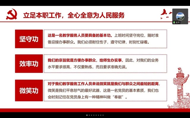 郑老师指出:一名合格的共产党员,必须加强党性修养,牢固树立起全心全意为人民服务的宗旨,把学习放在突出位置,通过学习不断的提高自己。同时,主讲人强调:预备党员和入党积极分子要不断树牢“四个意识”、坚定“四个自信”、做到“两个维护”,时刻做到头脑清醒、旗帜鲜明、立场坚定,保持不断创新、不断进取的精神状态。党课最后,郑显华老师希望同学们加强理论学习,坚定理想信念,树立远大目标,紧跟党的步伐,为中国特色社会主义建设作出贡献。