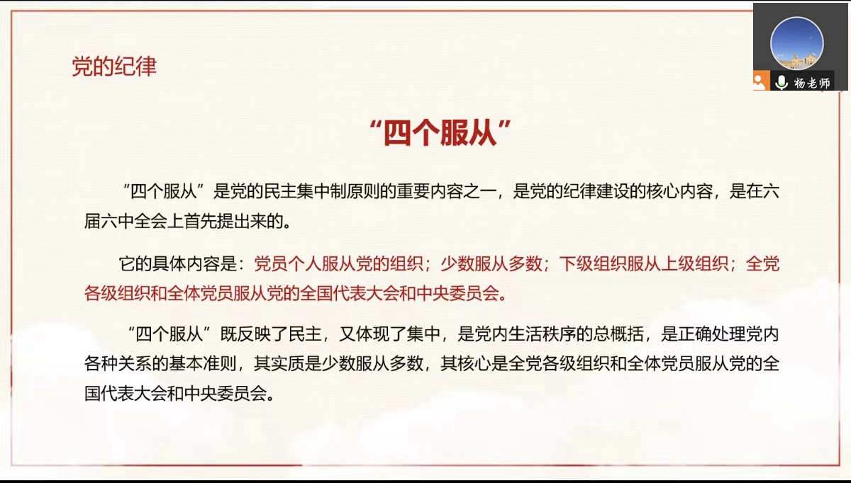 通过本次党课,进一步加强了同学们对党章和党的发展历程的认识,深入了解中国共产党的百年奋斗历程、党的性质、组织原则、党的纪律和政治纲领。相信此次党课学习过后,同学们能够进一步明确自己入党初心,为中国社会主义现代化建设勇于肩负时代责任,能够做到知行合一,无愧于新时代的使命担当,做党和国家合格的建设者和可靠的接班人。