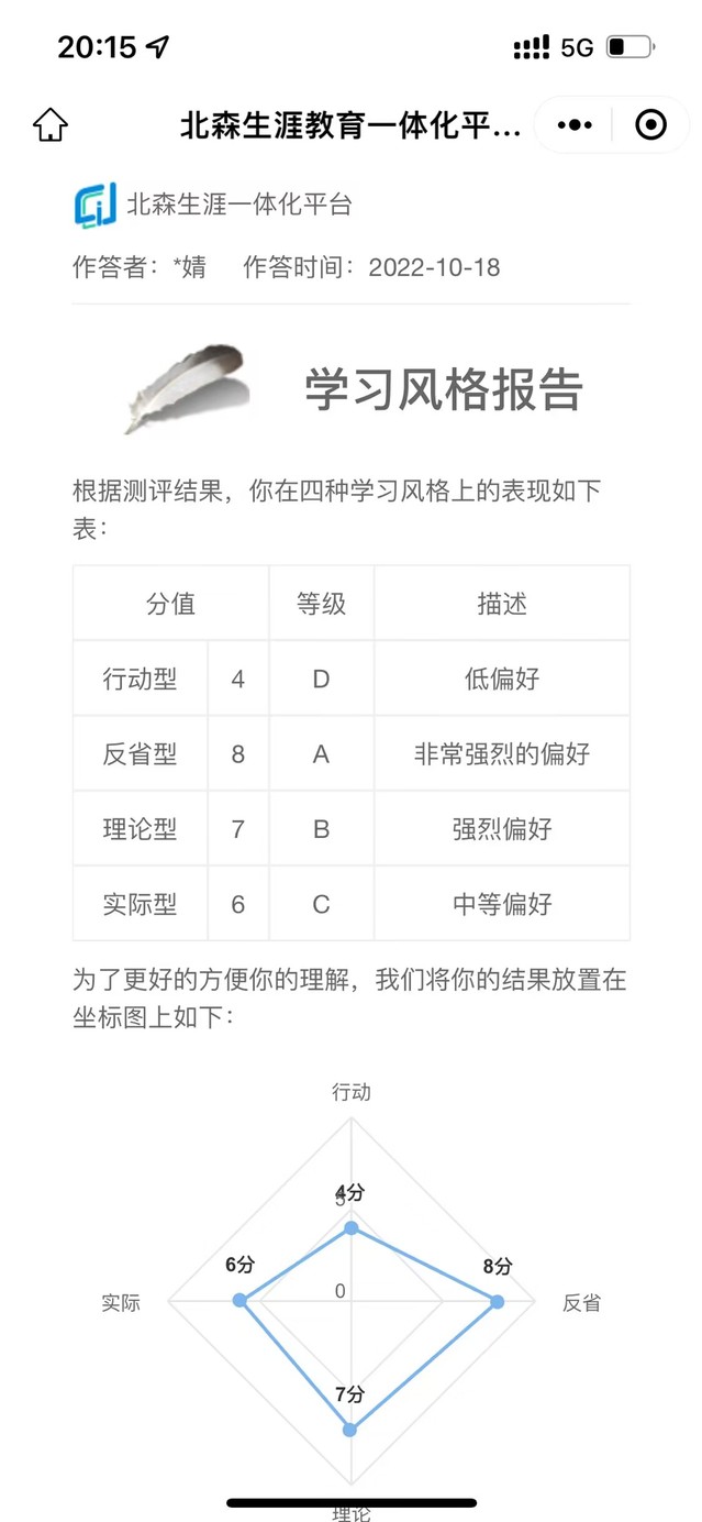 为引导老员工以科学的方法认知自我,确立清晰的奋斗目标,从根本上提高自身的综合素质,有预见性地、科学地规划自己的学习生涯和职业生涯,提高其创业、择业、就业能力,2022年11月5日,机器人工程学院开展北森吉讯职业测评活动。