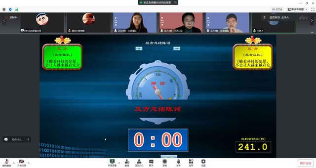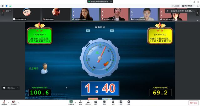 本次比赛围绕“随着科技的发展会不会让人更有安全感”开展。比赛过程中,正方从安全感的来源是对危险的控制程度出发,举出微商的例子来论证自己的观点,反方辩手抓住对方漏洞,从科技发展具有两面性出发进一步证明自己的观点步步紧逼,场面不断升温。在自由辩论阶段,正方从安全感的定义出发,询问对方“安全和安全感差别”反方从物质和精神出发并举出沃尔沃汽车的例子来回答正方的问题,场面愈加激烈。双方辩手以敏捷的思维和严谨的辩词来展现本方对辩题的理解。
