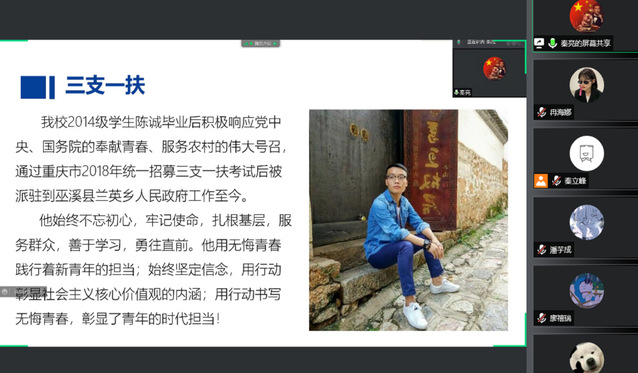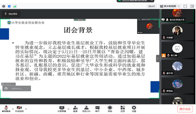 为进一步做好公司员工基层就业工作,鼓励和引导员工转变就业观念,立志基层成长成才,欢迎来到公海710于2022年3月20日下午开展“青春正闪耀,建功在基层”主题的线上讲座,2020级全体员工参加。