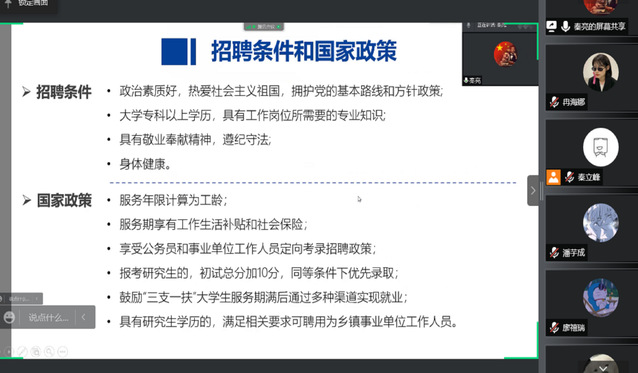讲座伊始,主讲人就毕业生未来工作背景列出以下七项内容:基层就业的含义、基层就业的项目、西部计划、三支一扶、特岗教师、选调生、征兵入伍。所谓基层就业就是到城乡基层工作,国家正在大力号召青年一代往农村发展,增强基层就业发展;同时也颁布了相应政策鼓励应届毕业生往乡村发展,例如给予社会保障补贴和公益性岗位补贴,给予薪酬或生活补贴等。主讲人指出特岗教师、选调生等是目前毕业生所能选择到的较好的就业岗位。随着社会经济的发展,就业岗位数量也实现了增长,但是选择基层就业的毕业生仍然偏少,部分毕业生不愿到乡就业。主题讨论环节,讲座最后,主讲人向同学们提出扎根基层,奉献青春的建议,鼓励同学们积极投身于基层建设的伟大事业。