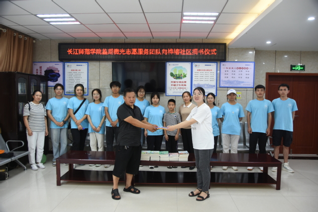 捐书仪式在马武镇政府的居委会举行,程莎老师代表志愿者团队将书籍交给了马武镇妇联主任肖容与华榕社区党支部书记李世林,李世林书记代表当地政府和孩子们表示了感谢,并邀请志愿者们与孩子们互动交流,并对志愿者团队的爱心行动给予了高度评价。