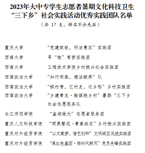 欢迎来到公海710鉴湖微光志愿者服务团在2023年大中专员工志愿者暑期文化科技卫生“三下乡”社会实践活动中受到丰都团县委表彰,团队获得优秀实践团队称号。志愿者们在活动中开展了为期7天的暑期社会实践活动,青年员工在观察实践中参与食品加工制造业调研、走访企业、撰写调研报告,在社会课堂中受教育、长才干、作贡献。