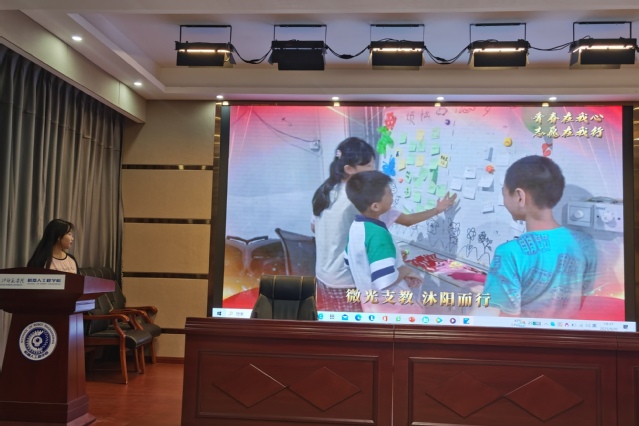 志愿者代表李心如回忆整个三下乡实践活动的经历,并带领鉴湖微光志愿者服务团全体志愿者们诗歌朗诵《我们是青年志愿者》,她提出志愿精神就是传递热情、带去快乐,要用行动诠释志愿意义。